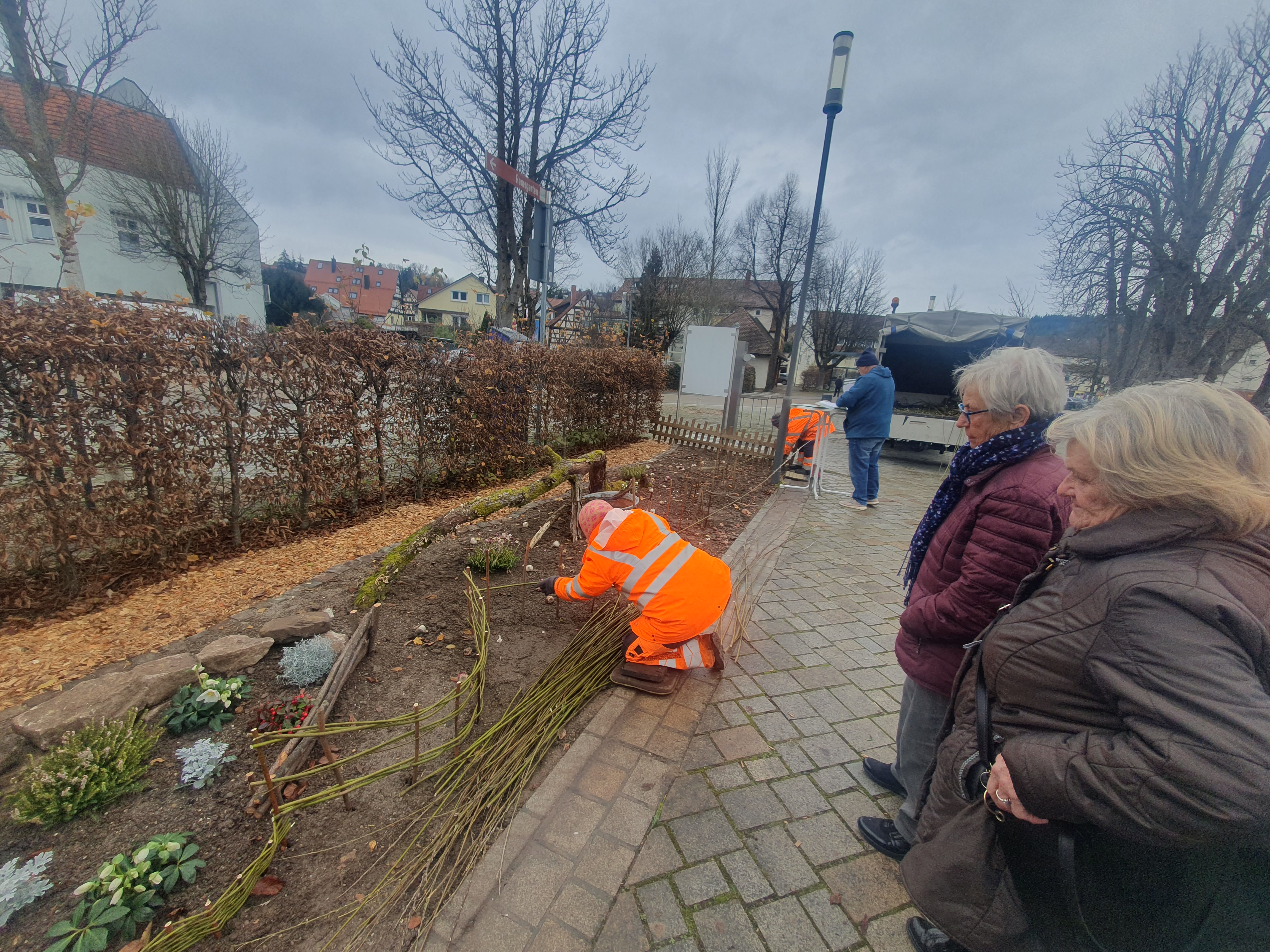 Beim Aktionstag auf dem Oria-Platz stellten zwei Bauhofmitarbeiterinnen ein neu angelegtes, naturnahes Beet vor. Einige Bürgerinnen und Bürger trotzten dem leichten Schneeregen und nutzten die Gelegenheit, sich vor Ort Anregungen für den eigenen Garten oder Vorgarten zu holen.