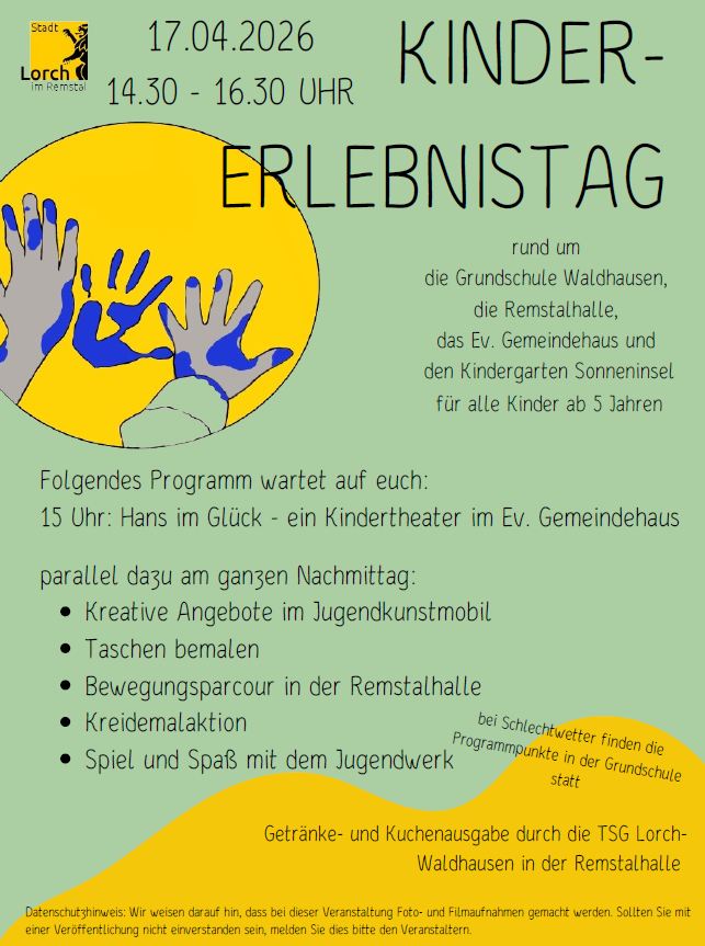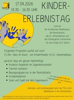 Der Kindererlebnistag beginnt um 14:30 Uhr mit einer kurzen Begrüßung auf dem Schulhof der Grundschule Waldhausen. Im Anschluss laden verschiedene Einrichtungen zu Mitmachaktionen ein, darunter die evangelische Kirchengemeinde, die Grundschule Waldhausen, der Jugendraum, die Stadtbücherei sowie die TSG Waldhausen in der Remstalhalle.