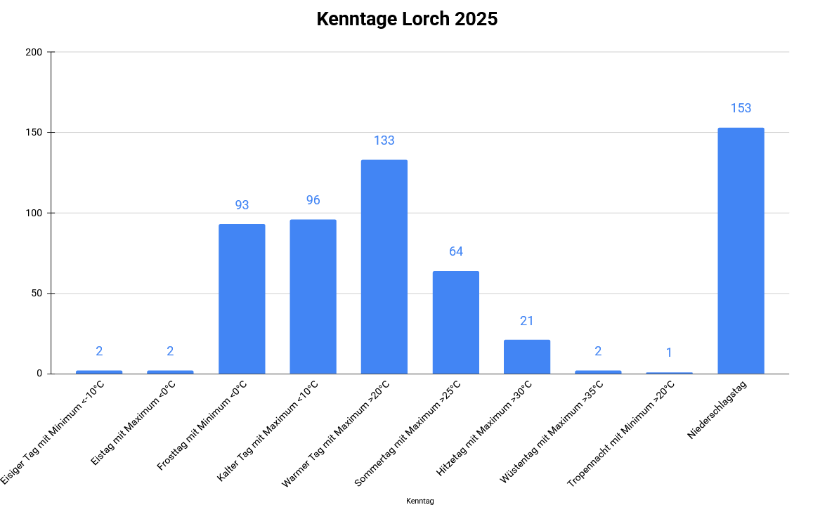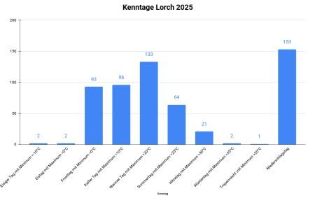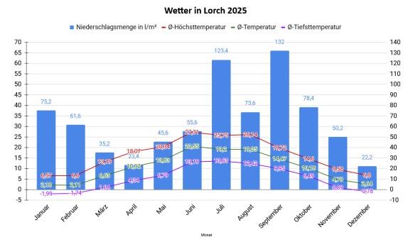 Das Wetterjahr 2025 in Lorch war deutlich zu warm und klar zu trocken. Trotz einzelner sehr niederschlagsreicher Monate konnte das ausgeprägte Defizit im Frühjahr und Frühsommer nicht ausgeglichen werden. Temperaturmäßig war das gesamte Jahr überdurchschnittlich.