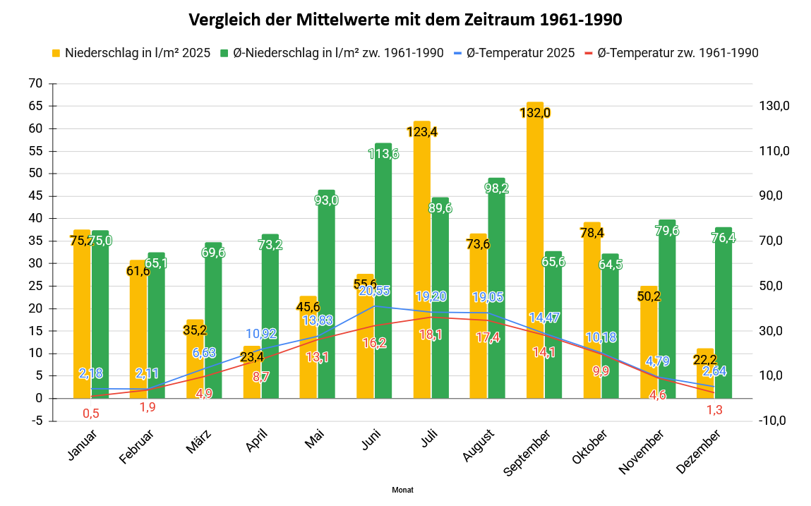 Die Jahresmitteltemperatur 2025 beträgt rund 10,6°C, dies ist ein Plus im Vergleich zum langjährigen Klimamittel (1961-1990) von 1,3K (Kelvin) und liegt somit deutlich über dem klimatologischen Mittel. Auffällig ist, dass alle Monate über dem Klimamittel lagen. Im auffällig warmen Sommerhalbjahr, insbesondere Juni bis August, lagen die Temperaturen durchwegs deutlich über dem langjährigen Mittel.