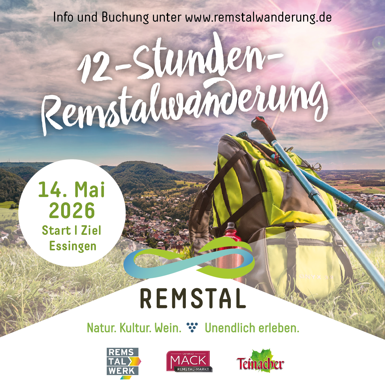 Die 12-Stunden-Remstalwanderung wird 2026 wieder an Christi Himmelfahrt als Rundwanderung durchgeführt. Auf einer Strecke von ca. 44 km und 910 Höhenmetern geht es von Essingen durch die Naturschutzgebiete Weiherwiesen und Wental Richtung Bartholomä und Lauterburg und über den Rosenstein zurück nach Essingen. Gestartet wird um 9 Uhr an der Schönbrunnenhalle in Essingen.